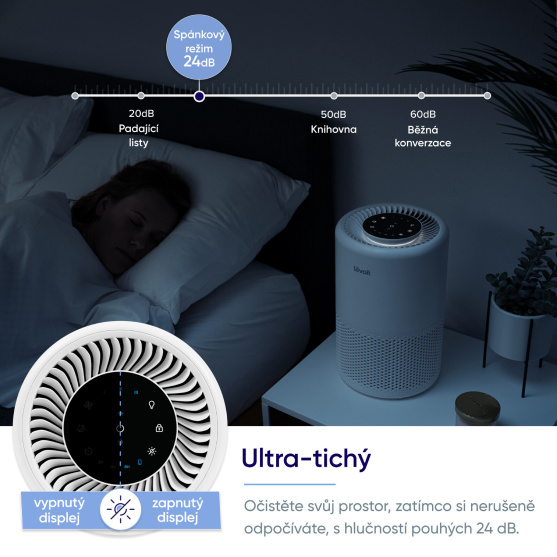 Díky patentované technologii QuietKEAPTM ani nebudete vědet, že je čistička Levoit Core 200S v provozu. Při nejvyšším výkonu dosahuje již tak nízké hlučnosti 45dB. Pro nerušený spánek se přímo nabízí noční režim, v kterým je hlučnost ještě nižší – 24 dB. V nočním režimu se také aktivuje tlumené osvětlení a můžete si vypnout podsvícení ikonek.
