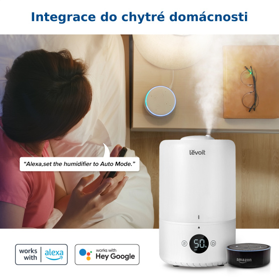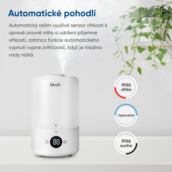 Zvlhčovač vzduchu Levoit Dual 200S Smart lze ovládat přímo na přehledném podsvíceném LED displeji nebo také přes aplikaci na chytrých zařízeních Apple nebo Android. Nebo si ho můžete dokonce připojit do svého Smart Home a ovládat hlasem přes Google Assistant nebo Amazon Alexa. Senzor vlhkosti zobrazuje vlhkost v reálném čase a v automatickém režimu tak okamžitě reaguje na změny vlhkosti. Vždy by se mělo jednat o rozmezí mezi 40 % až 60 %. Přes aplikaci si můžete informace kontrolovat nebo si své režimy plánovat.