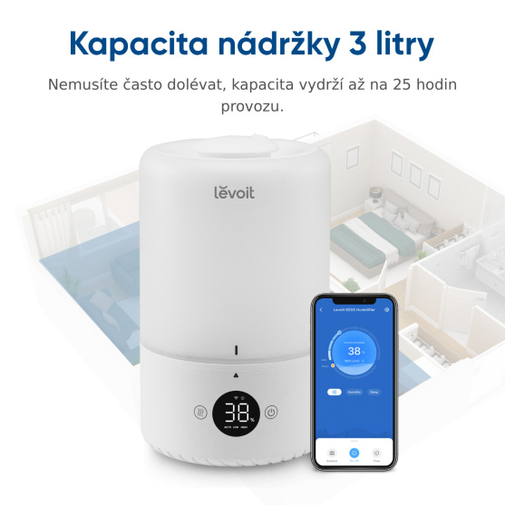 Levoit Dual 200S Smart disponuje 3l nádobou na vodu a s vysokým výkonem hravě pokryje místnosti do velikosti až 27m². Maximální doba provozu je až 25 hodin v závislosti na použitém programu zvlhčovače. Když voda dojde, zařízení se samo automaticky vypne, aby nedošlo k poškození a informuje vás také přes aplikaci v chytrém zařízení.