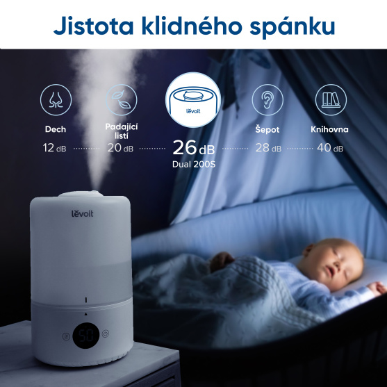 Konstrukčně byl použitý hydraulický ventilátor a provoz je díky němu velice tichý a nebude vás rušit ani při spaní. Budete moci nerušeně snít a zvlhčovač Levoit Dual 200S Smart se postará o kvalitu a vlhkost vzduchu v místnosti podle vašich představ.