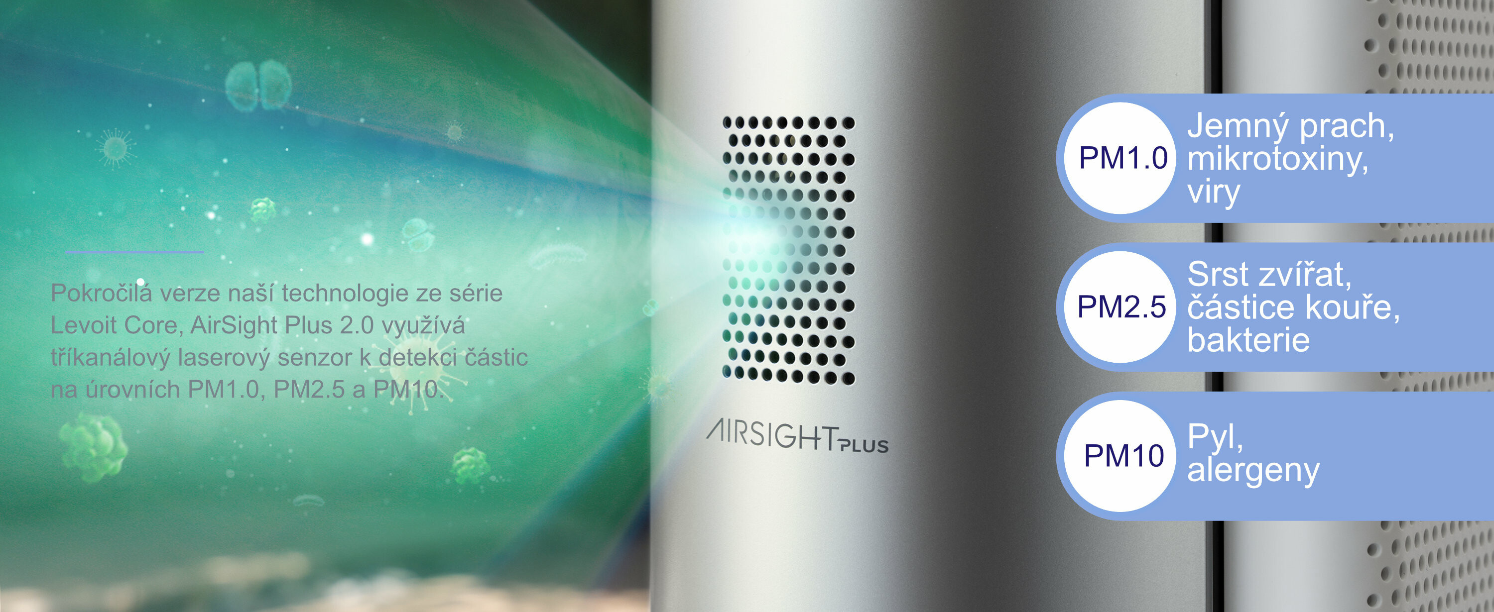 Technologie AirSightTM PLUS 2.0 je postavená na skenování kvality vzduchu speciálním troj kanálovým prachovým laserovým senzorem. Ten je schopen zaznamenat znečištění částicemi až 3x menšími než běžně používané infračervené senzory. Podle aktuální kvality vzduchu pak čistička Levoit nastavuje požadovaný výkon tak, aby co nejefektivněji a rychle vzduch vyčistila.